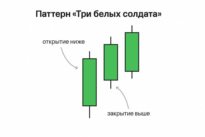 Понятная интерпретация. В отличие от сложных фигур с десятком условий, «Три белых солдата» дают простой и читаемый сигнал: три последовательных периода роста подряд. Это снижает вероятность субъективных трактовок.