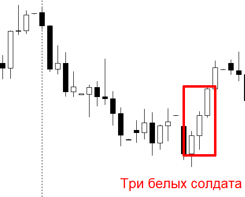 «Три белых солдата» — разворотная свечная модель, показывающая, что рынок утратил нисходящий импульс и получил поддержку покупателей. Три идущих друг за другом бычьи свечи с закрытиями выше предыдущих образуют узнаваемый рисунок, который давно закрепился в техническом анализе.