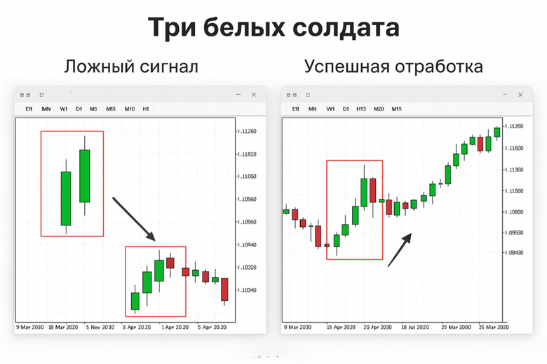 Для участника рынка «Три белых солдата» — это прежде всего индикатор изменения рыночных настроений. После серии нисходящих движений фигура показывает, что покупатели вновь способны удерживать инициативу и последовательно продвигать цену выше.